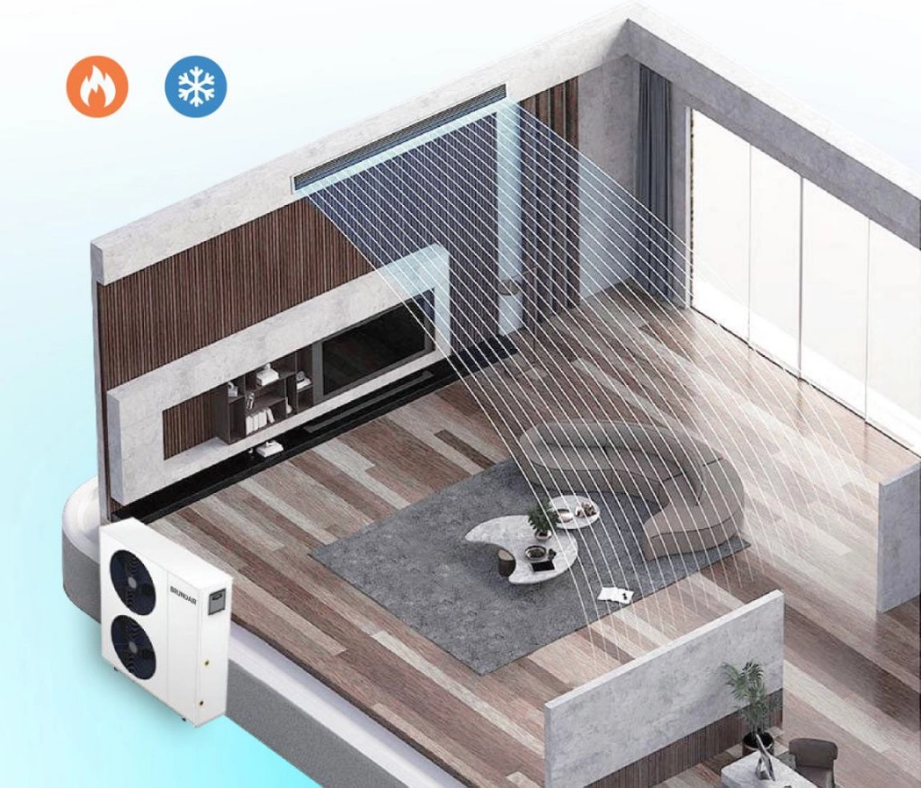 Pajisja është e pajisur me kompresor DC inverter dhe motor ventilatori pa furça (DC brushless), duke mundësuar rregullim të vazhdueshëm të kapacitetit nga 20% deri në 120%, sipas nevojave reale. Kjo pompë termike punon sipas parimit "output on demand" – jep aq sa është e nevojshme, as më shumë e as më pak, për të arritur efikasitet maksimal dhe komoditet të pandërprerë.