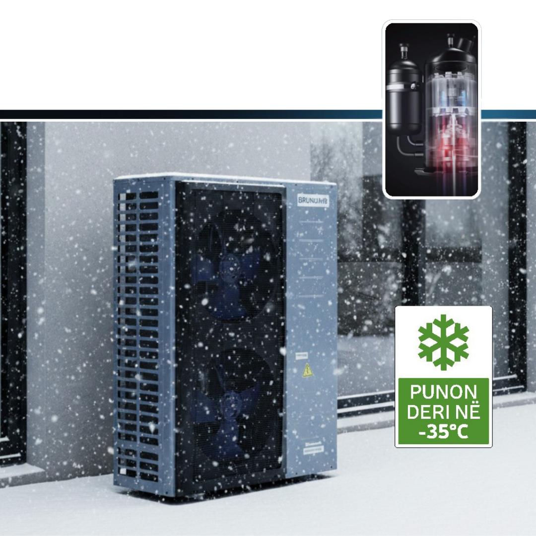 BrunoAir R290 Monoblock, është pompë termike e avancuar monoblock, e pajisur me kompresor PANASONIC dhe teknologjinë EVI (Enhanced Vapor Injec­on). EVI (Enhanced Vapor Injec­on) është teknologji e avancuar e kompresimit që injekton avull shtesë gjatë ciklit të punës së kompresorit, duke mundësuar ngrohje stabile edhe në temperatura deri në -35°C, rritje të efikasite­t COP në kushte të ftohta; kapacitet më të madh ngrohjeje në dimër dhe jetëgjatësi më të madhe të kompresorit falë ngarkesës së balancuar të punës. Me gaz ekologjik R290, Wi - Fi të integruar, dhe dizajn elegant me një ven­lator të qetë, kjo pompë përfaqëson gjeneratën e re të pompave termike për shtëpitë moderne dhe bizneset që kërkojnë teknologji të pastër dhe performancë superiore. Falë kombinimit të këtyre inovacioneve, ofron efikasitet të jashtëzakonshëm të konsumit të energjisë, funksionim të qëndrueshëm në temperatura ekstreme, dhe komfort të plotë gjatë gjithë vi­t si për ngrohje, ngrohje ashtu edhe për ujë të ngrohtë sanitar (DHW), ku temperatura e ujit arrinë deri në 70°C.