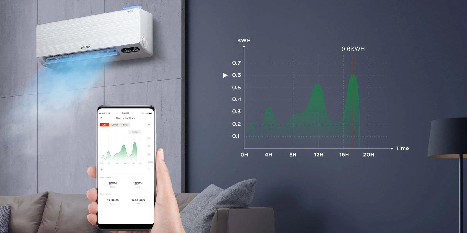 BrunoAir Home APP mund të shfaqë konsumin e energjisë elektrike në një tabelë grafiku, përdoruesit do të jenë në gjendje të shohin sa energji elektrike kanë përdorur dhe të mbajnë parasysh koston e tyre mujore në AC.